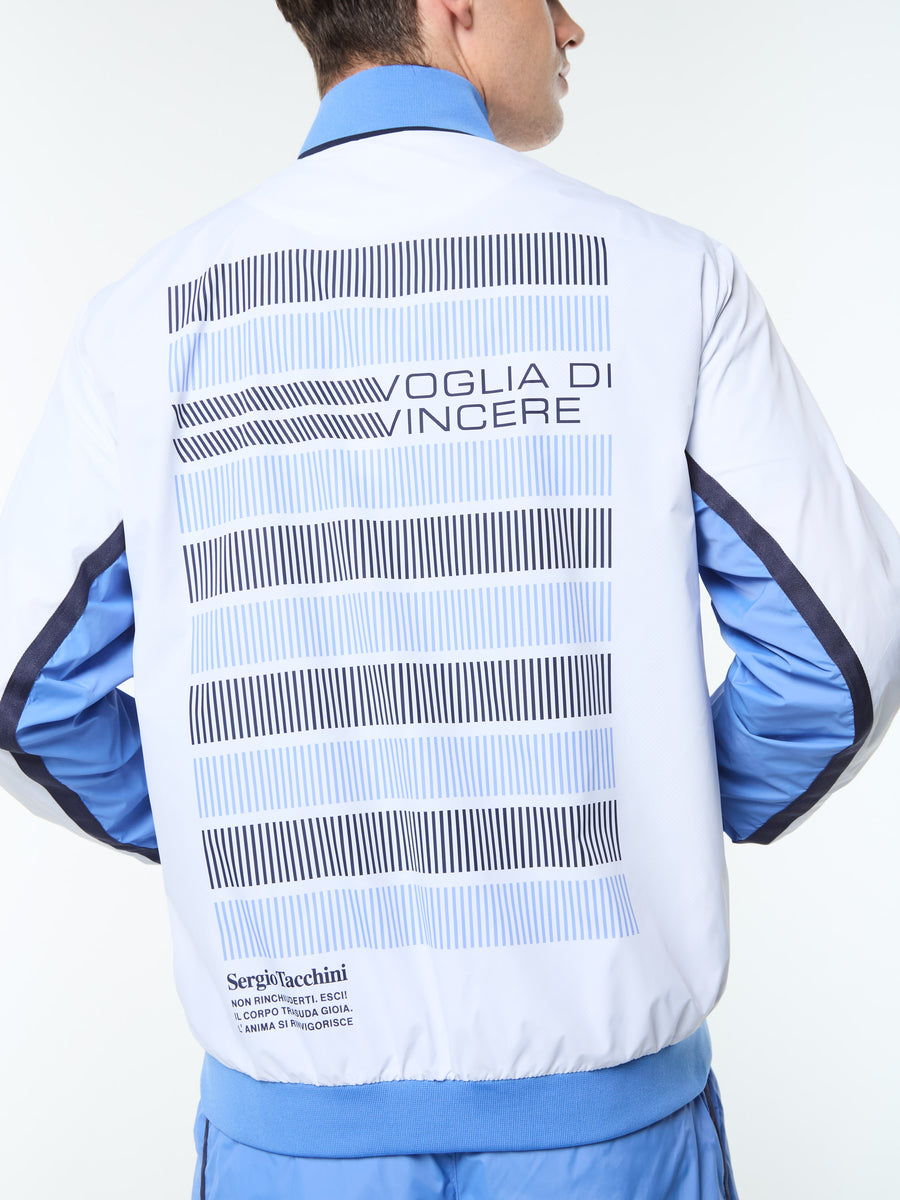 Sport meets statement. The Campo Court Track Jacket is crafted from crisp and lightweight nylon taffeta with a breathable mesh lining—built to move on and off the court. Bold color-block paneling and contrast taping deliver a dynamic visual punch, while custom Sergio Tacchini artwork and Italian sports slogans at the back celebrate the brand's heritage. Voglia di vincere— desire to win.